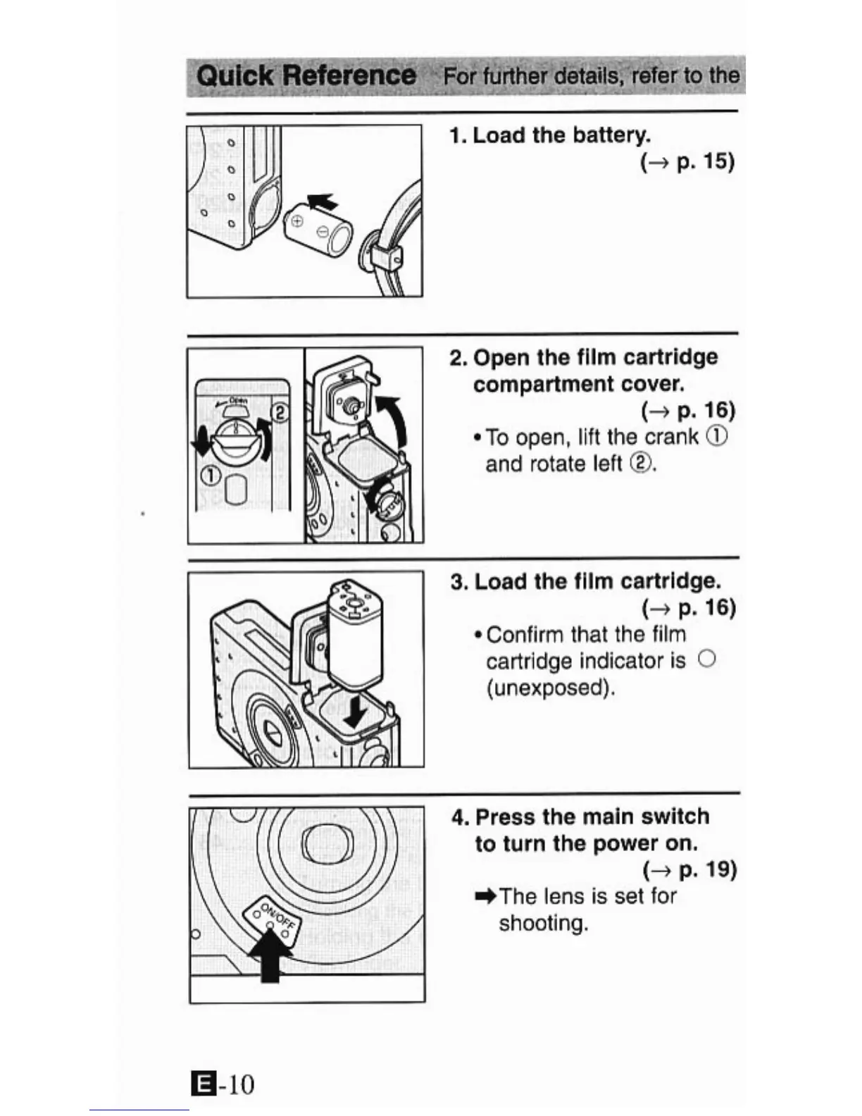 Canon ELPH - Quick Reference Guide; Battery and Film Loading Steps; Powering On and Basic Setup