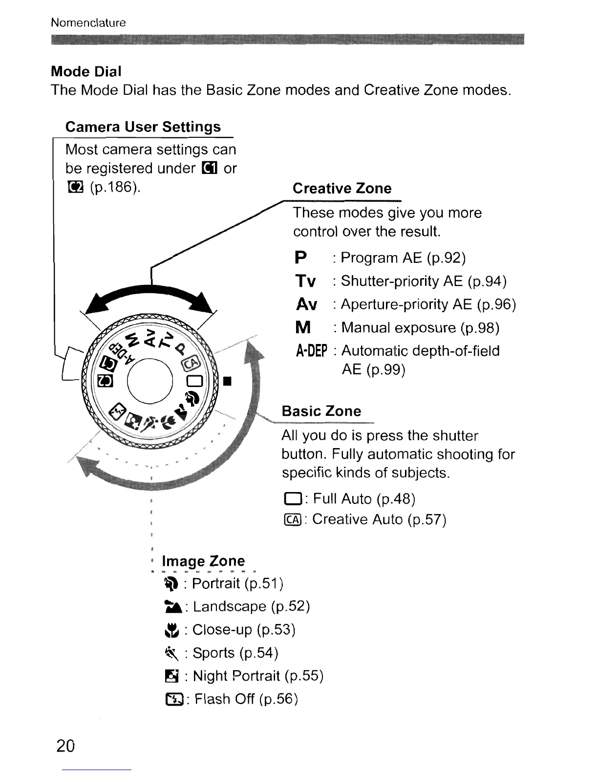 The Mode Dial has the Basic Zone modes and Creative Zone modes.