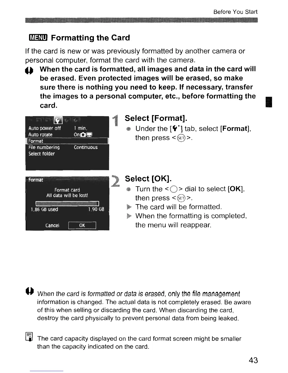 The card capacity displayed on the card format screen might be smaller