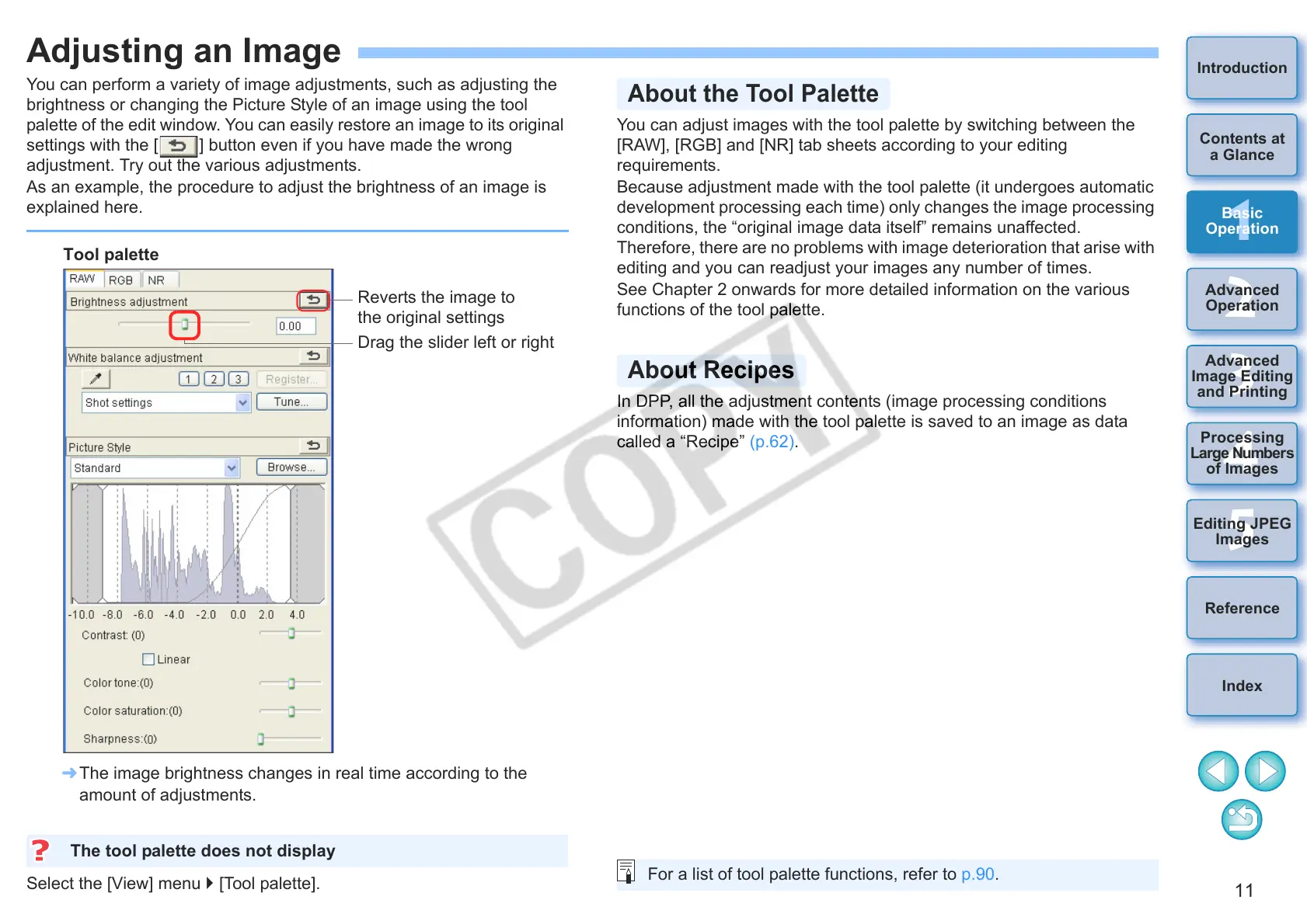 You can adjust images with the tool palette by switching between the