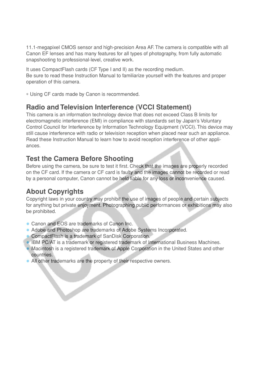 Before using the camera, be sure to test it first. Check that the images are properly recorded
