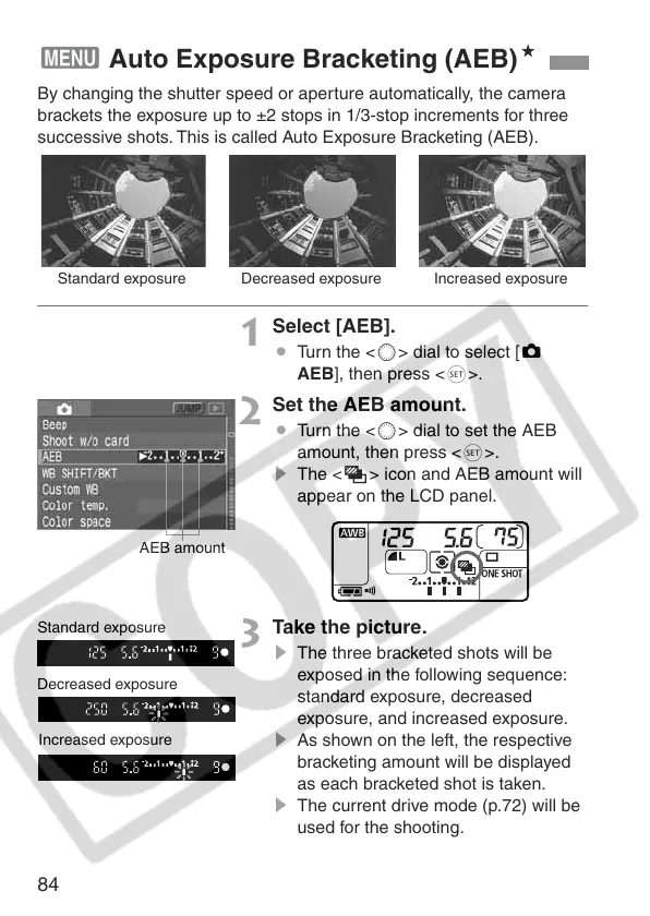 brackets the exposure up to ±2 stops in 1/3-stop increments for three