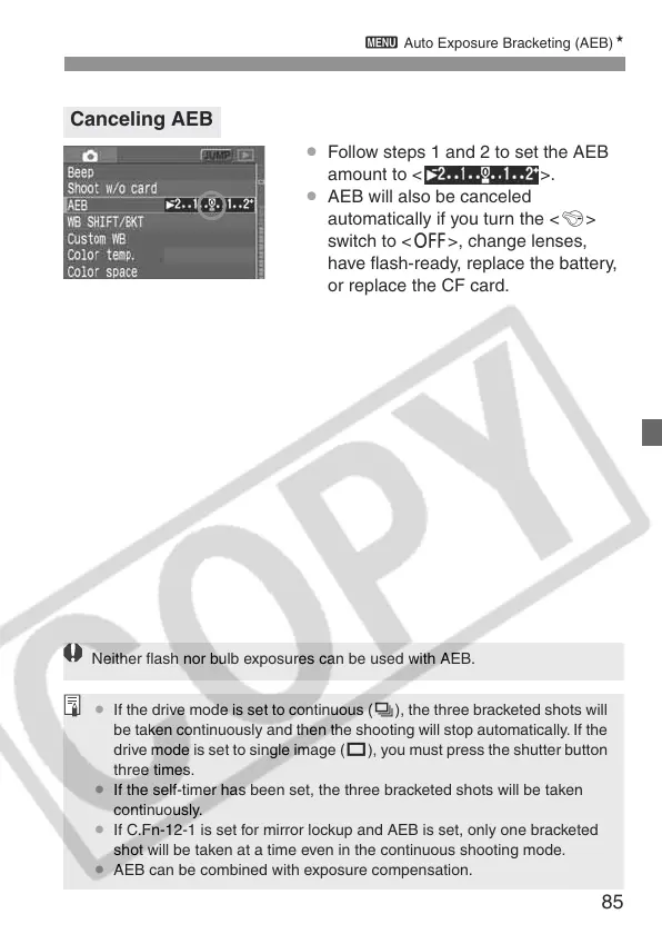 Neither flash nor bulb exposures can be used with AEB.