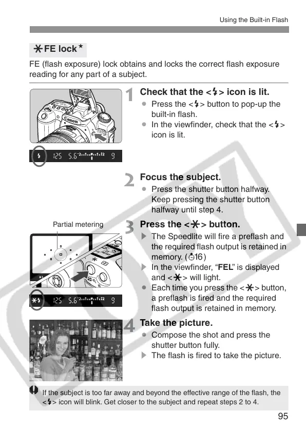 FE (flash exposure) lock obtains and locks the correct flash exposure