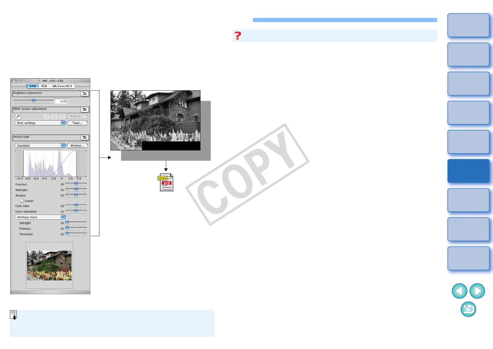 The adjustment contents of JPEG or TIFF images (p.90) can be