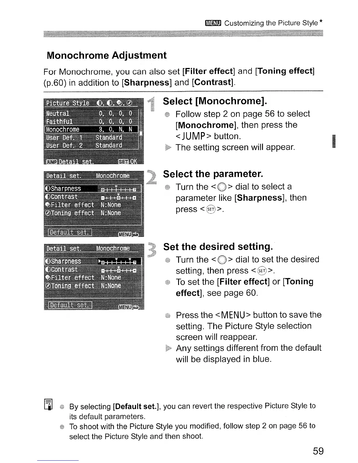 By selecting [Default set.], you can revert the respective Picture Style to