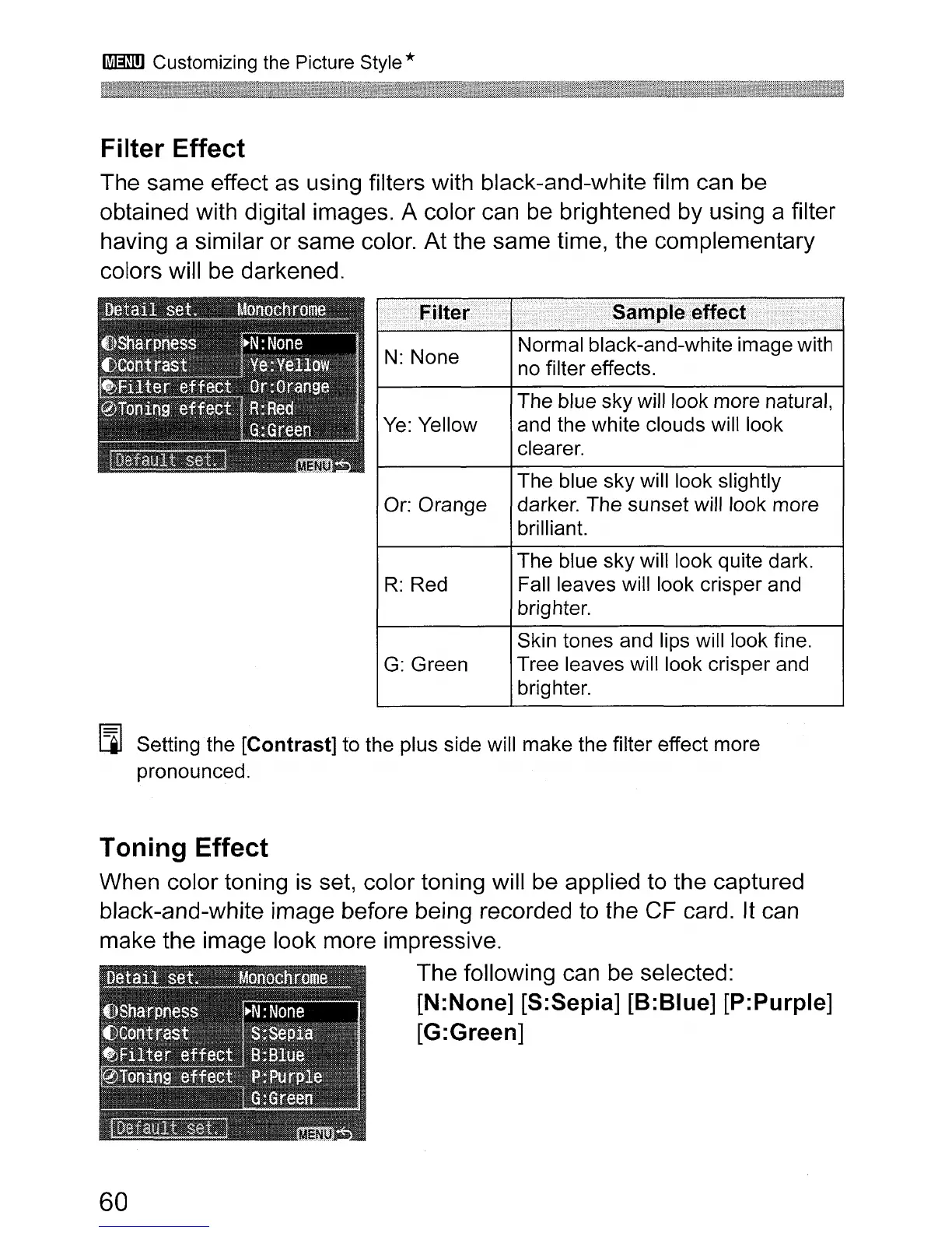Setting the [Contrast] to the plus side will make the filter effect more