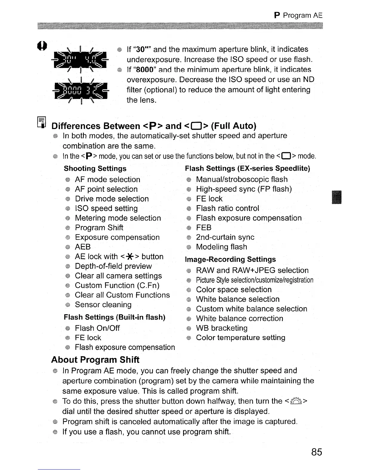 both modes, the automatically-set shutter speed and aperture