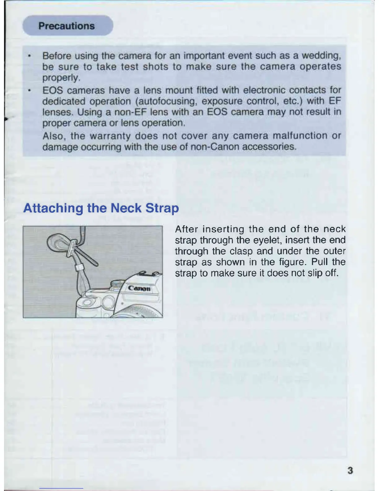 Canon EOS 50 - Precautions; Attaching the Neck Strap