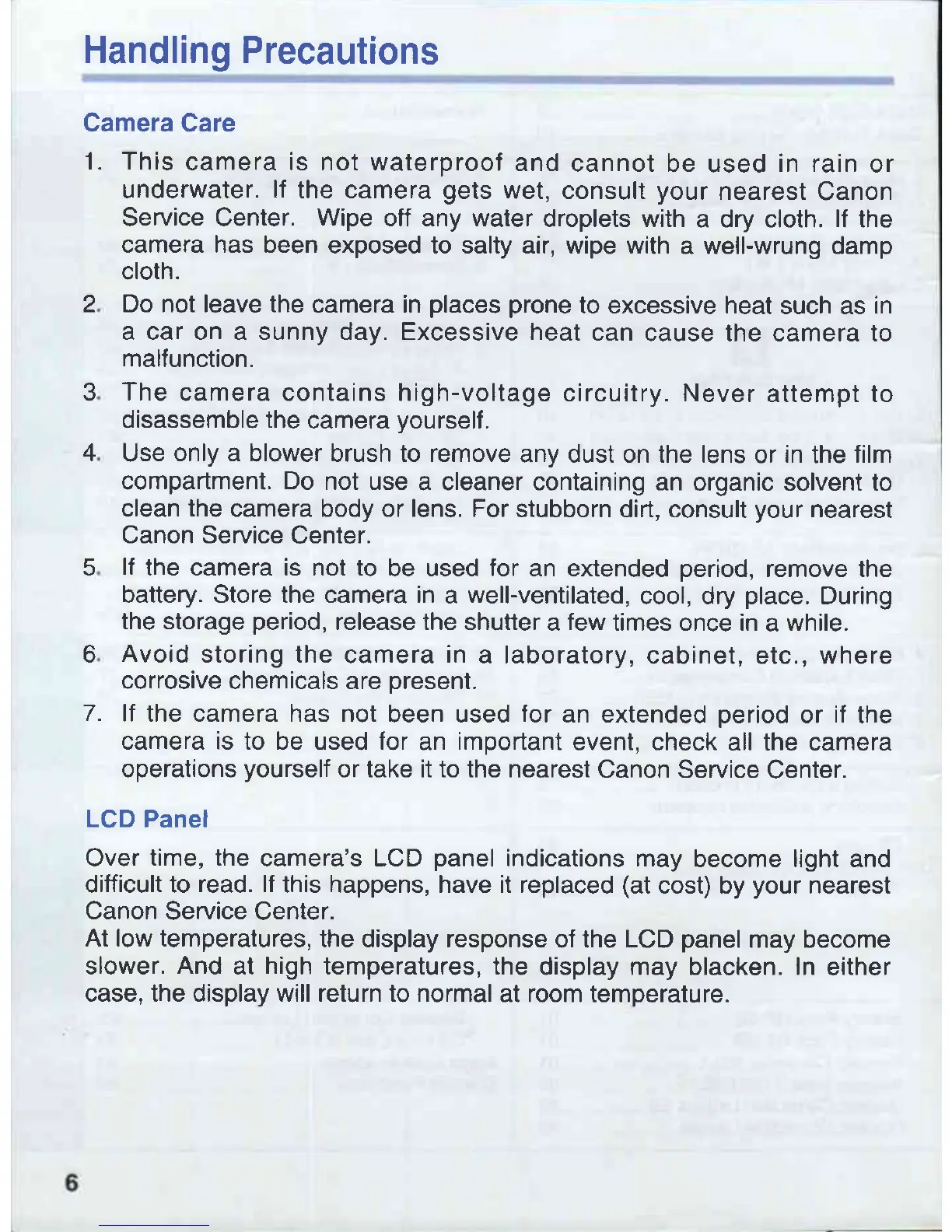 Canon EOS 50 - Handling Precautions and Battery Information; Camera Care Guidelines