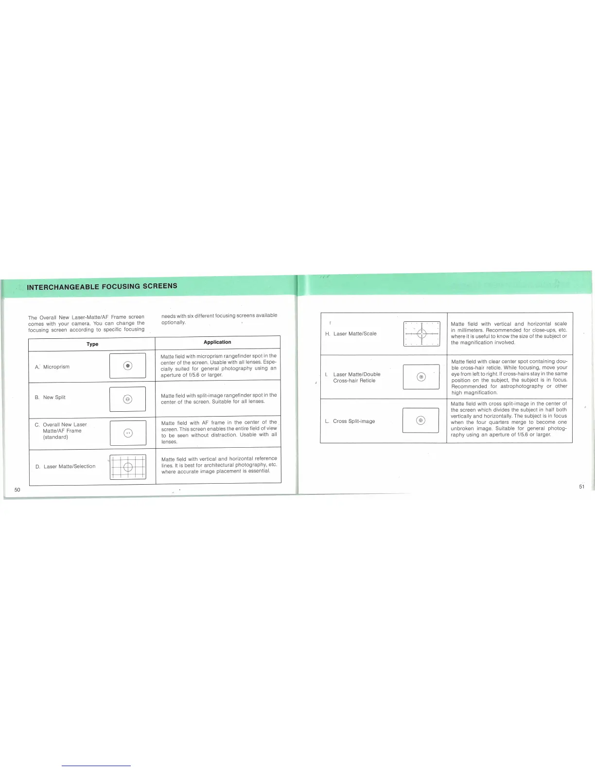 Canon EOS 600 - Interchangeable Focusing Screens; Screen Types and Applications