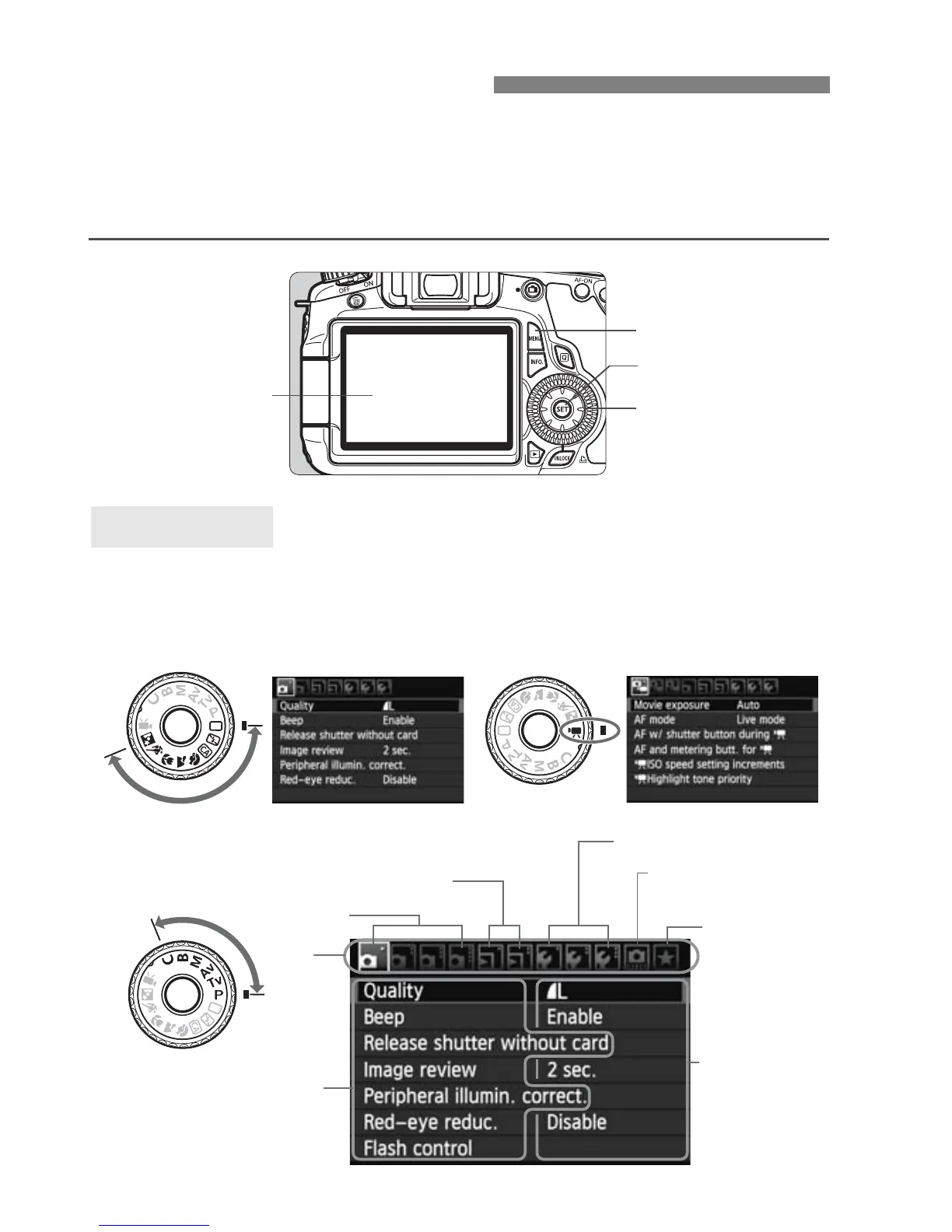 In the Basic Zone, Creative Zone, and Movie shooting modes, the tabs
