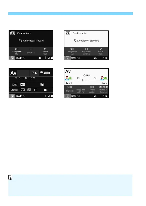 to the set shooting mode are displayed on the Quick Control screen. Note