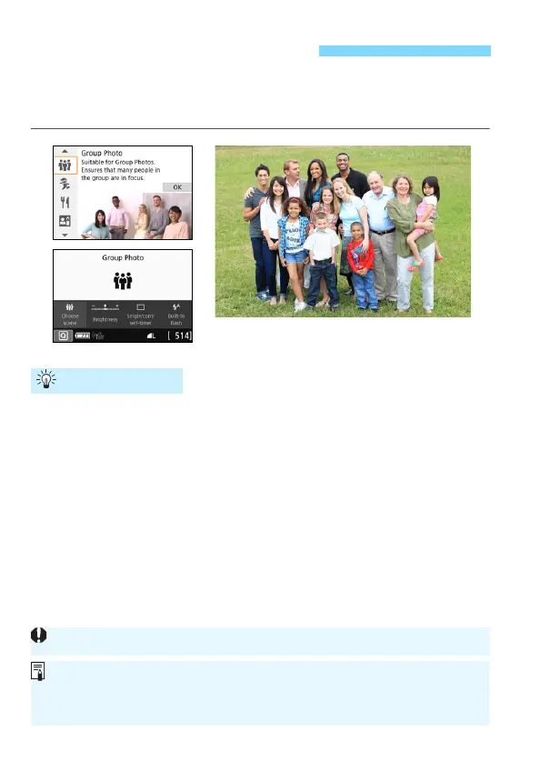 Use the <q> (Group Photo) mode to shoot group photos. You can take