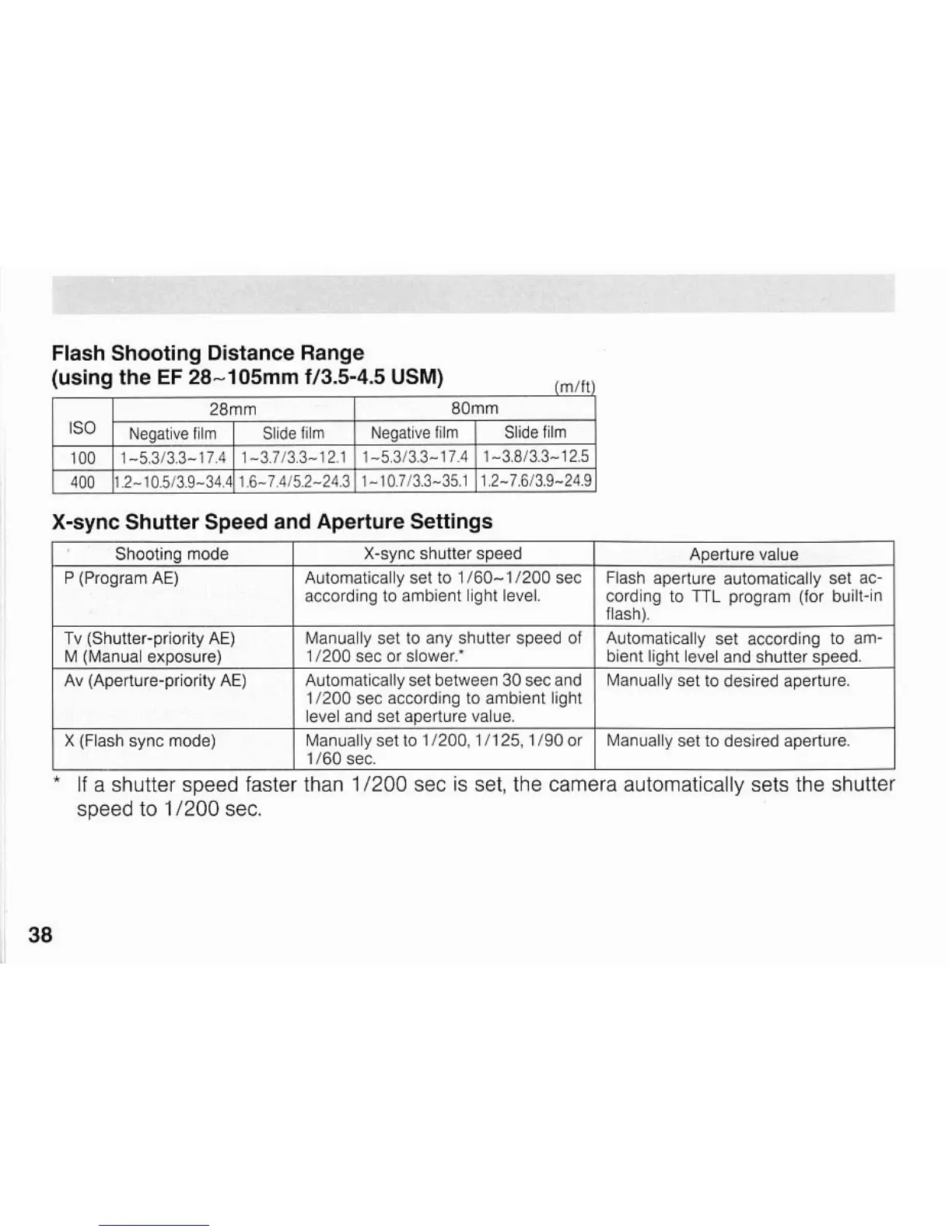 Canon EOS A2/A2E - Flash Performance Data; Flash Shooting Distance Range; X-sync Shutter Speed Settings