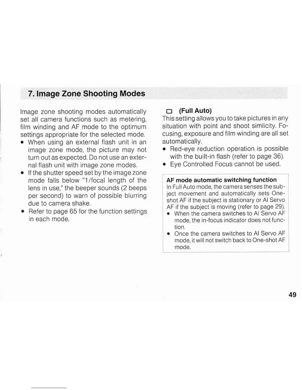 Canon EOS A2/A2E - Image Zone Shooting Modes; Automatic Camera Settings; Full Auto Mode; AF Mode Switching in Full Auto