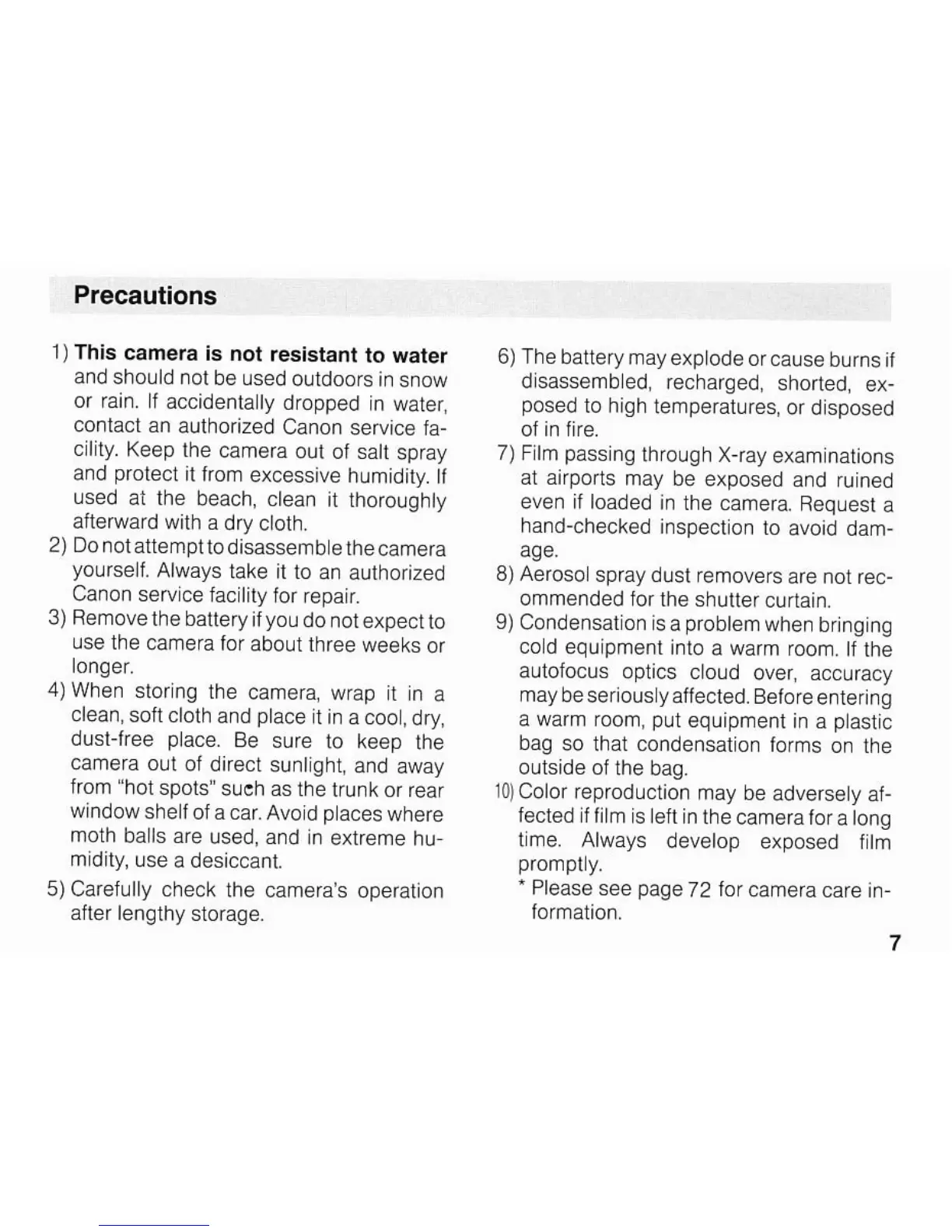 Canon EOS A2/A2E - Precautions and Safety; General Camera Handling
