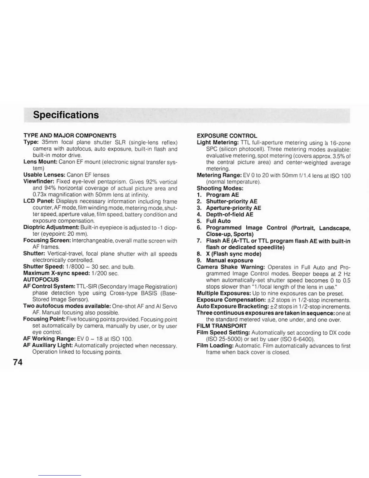 Canon EOS A2/A2E - Camera Specifications; Type and Components; Autofocus System Specifications; Exposure Control Specifications