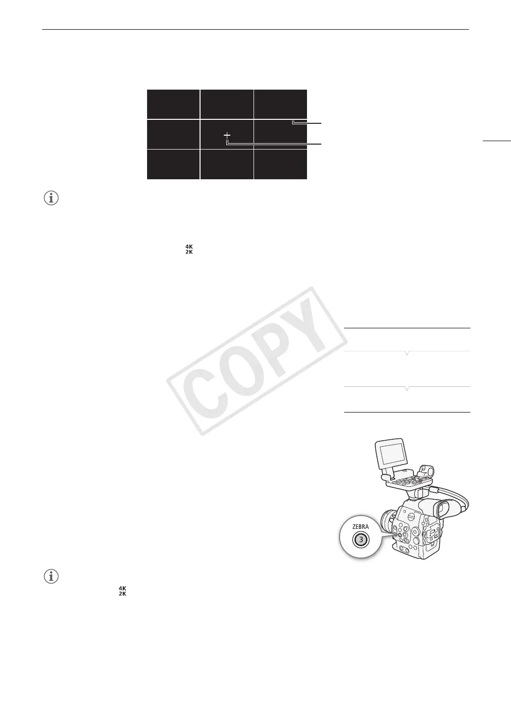 • You can use the [ 4K/2K/MXF Setup] > [HD/SD Output] > [Zebra HD Output] setting to display the zebra