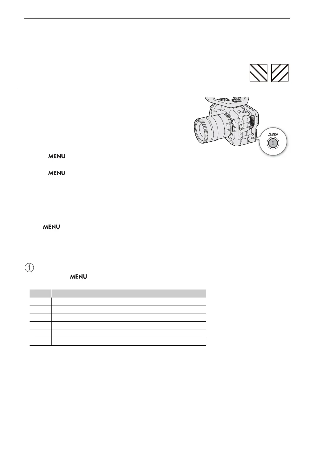 the [Zebra:] settings (A 105), to turn the zebra pattern overlay