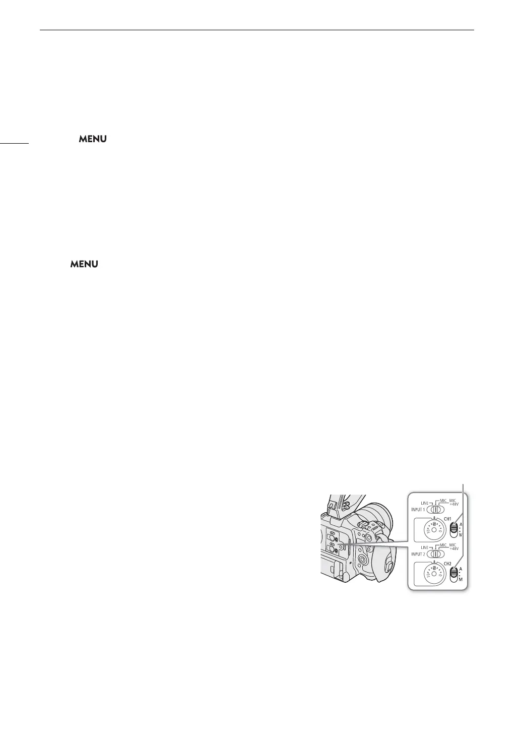 select automatic or manual audio level adjustment, and adjust each audio channel separately or adjust CH1/