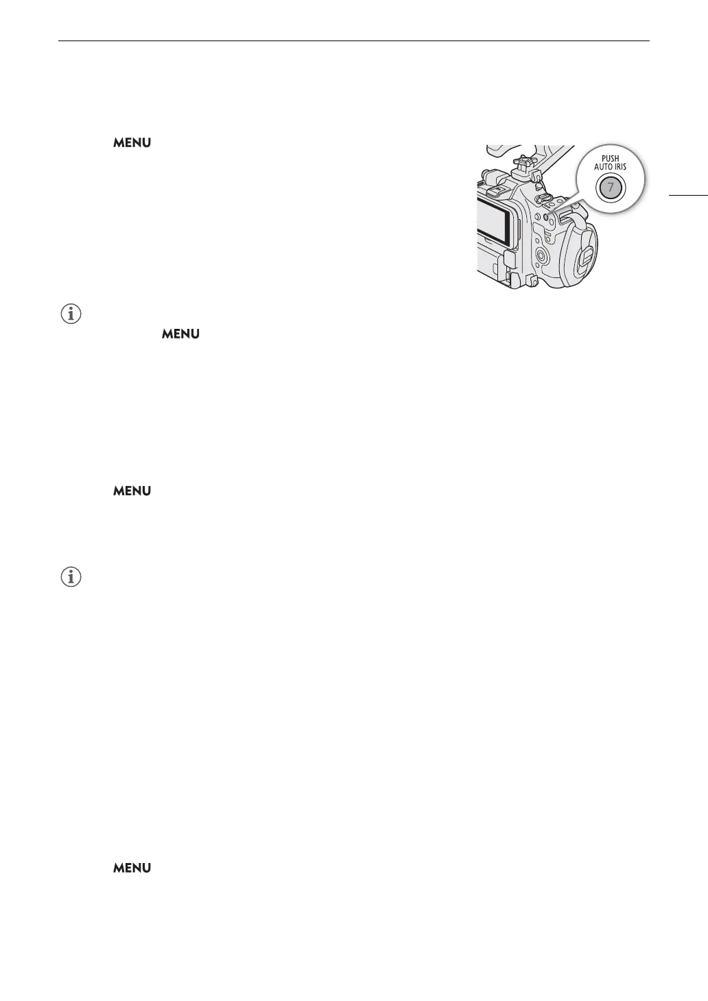 • If you set an assignable button to [Iris Mode] (A 123), you can press the button to toggle between the