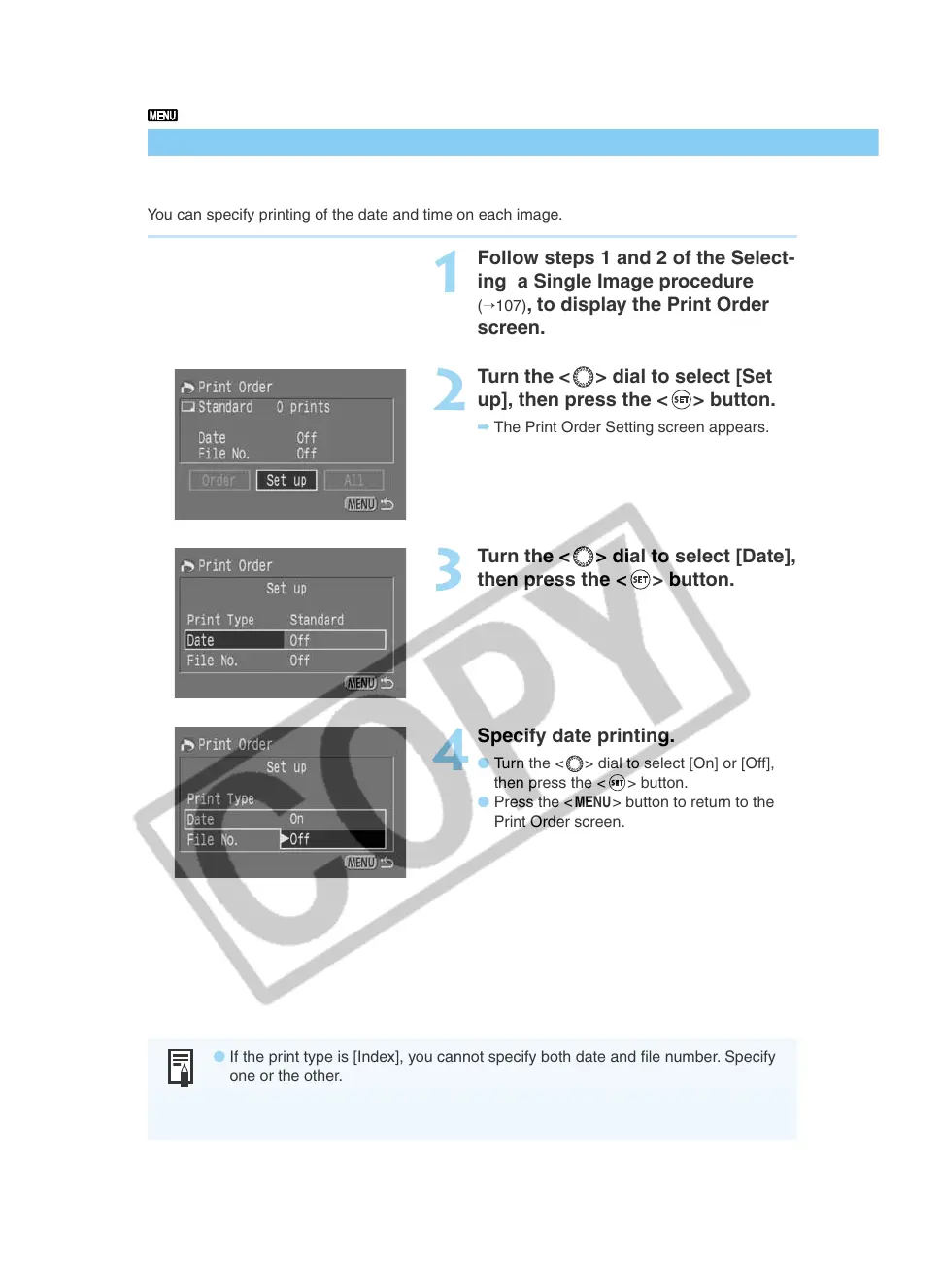 ● If the print type is [Index], you cannot specify both date and file number. Specify