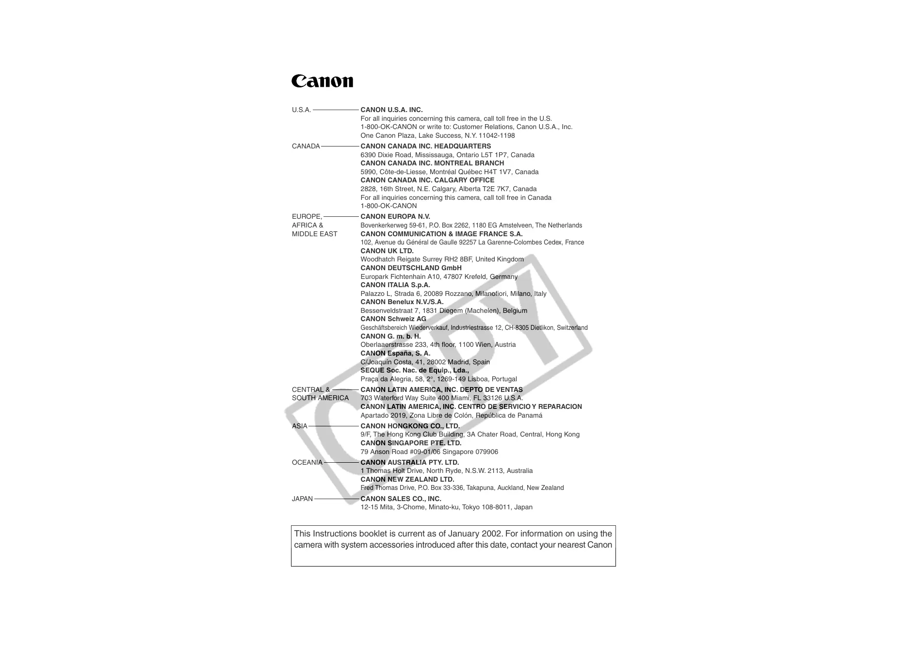camera with system accessories introduced after this date, contact your nearest Canon