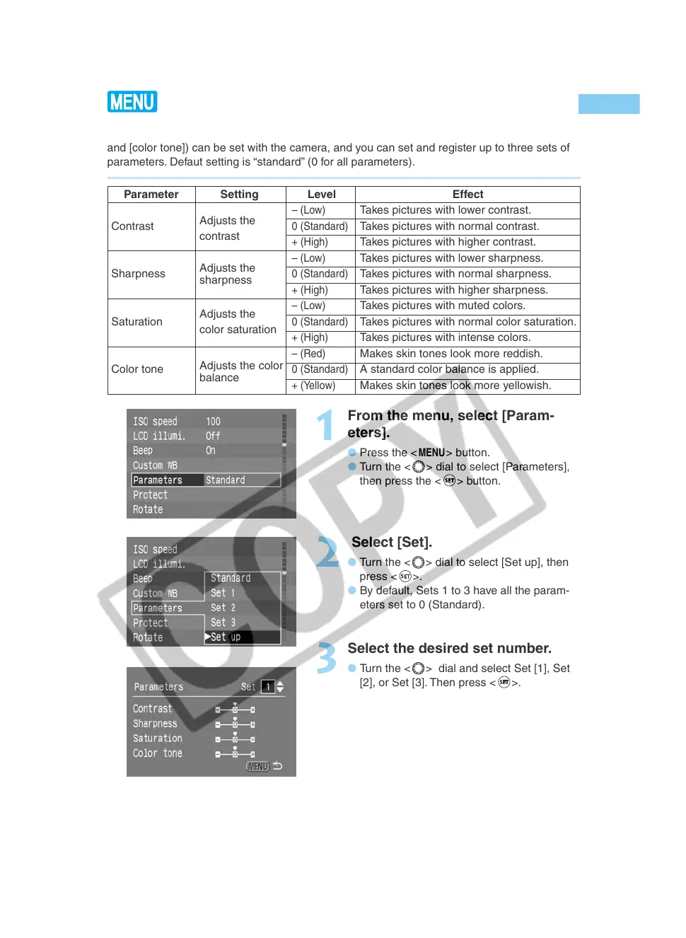 and [color tone]) can be set with the camera, and you can set and register up to three sets of