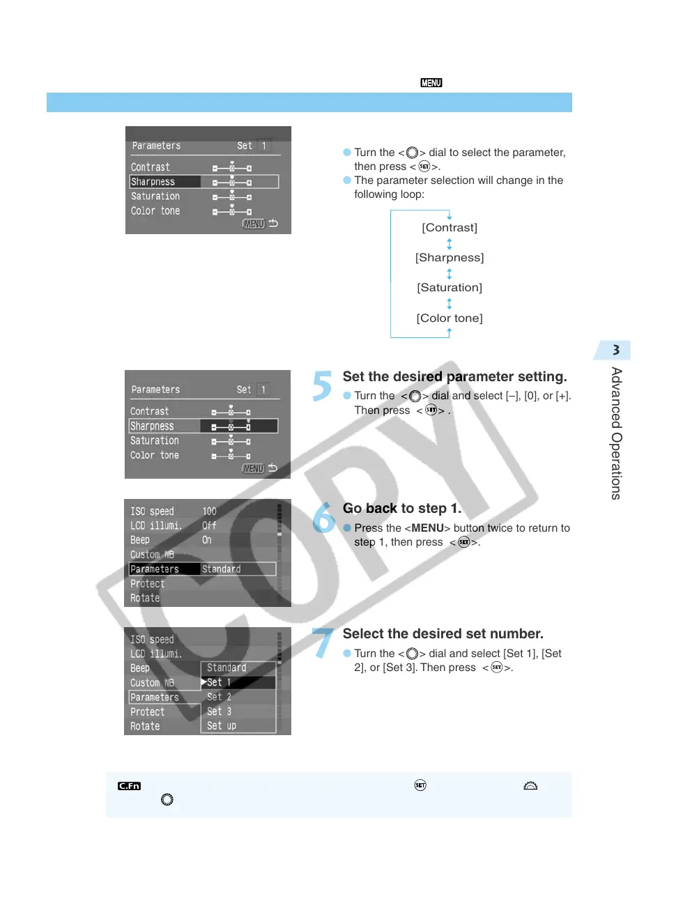 You can set the processing parameter by pressing < > and turning the <