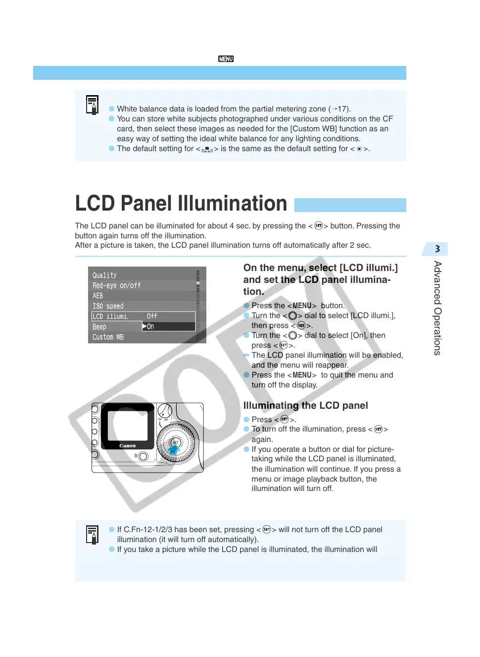 ● If C.Fn-12-1/2/3 has been set, pressing < > will not turn off the LCD panel