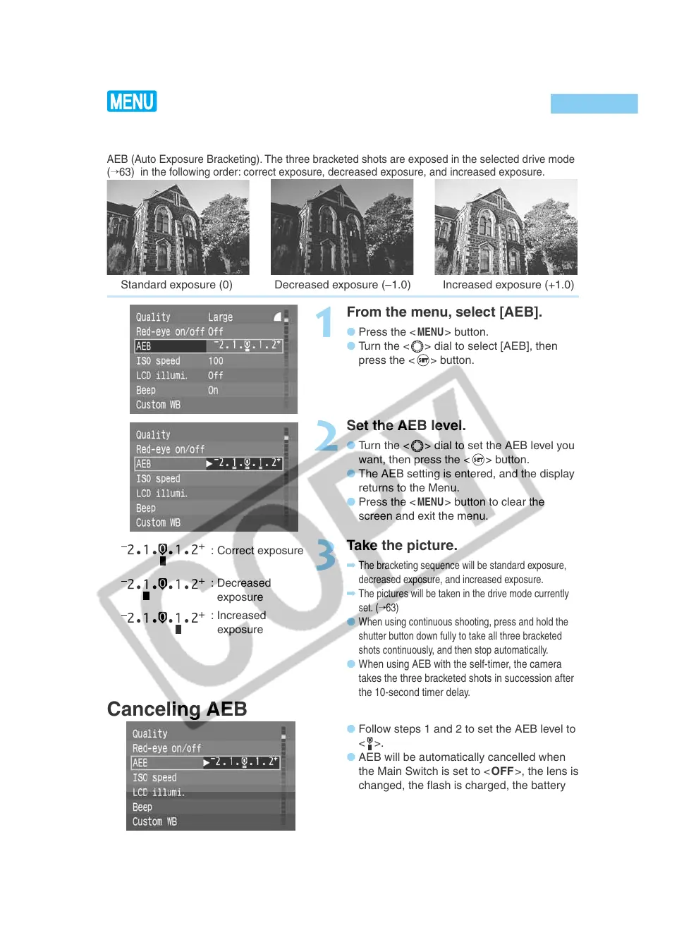 (→63) in the following order: correct exposure, decreased exposure, and increased exposure.