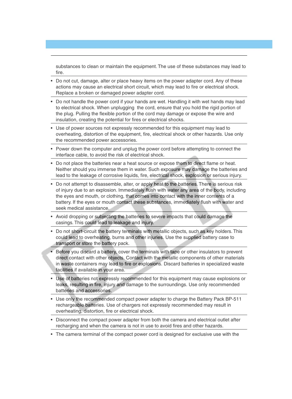 • Use only the recommended compact power adapter to charge the Battery Pack BP-511