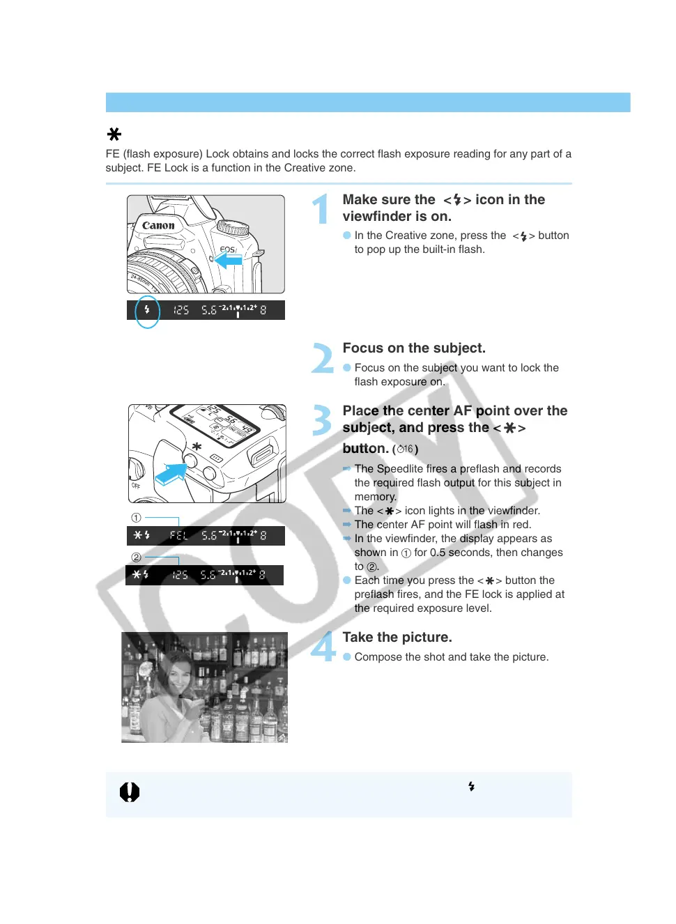 FE (flash exposure) Lock obtains and locks the correct flash exposure reading for any part of a