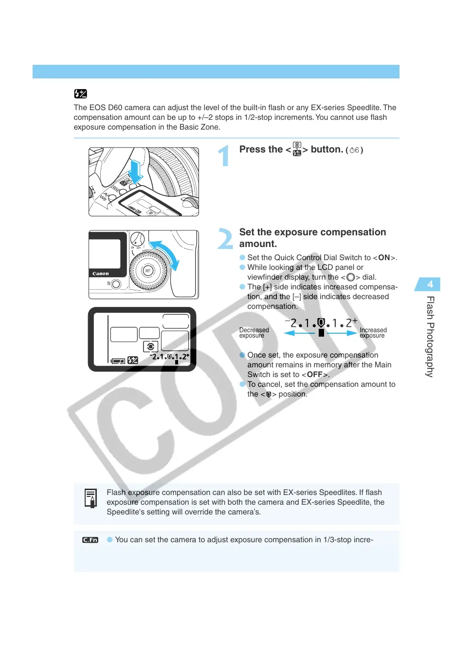 Flash exposure compensation can also be set with EX-series Speedlites. If flash