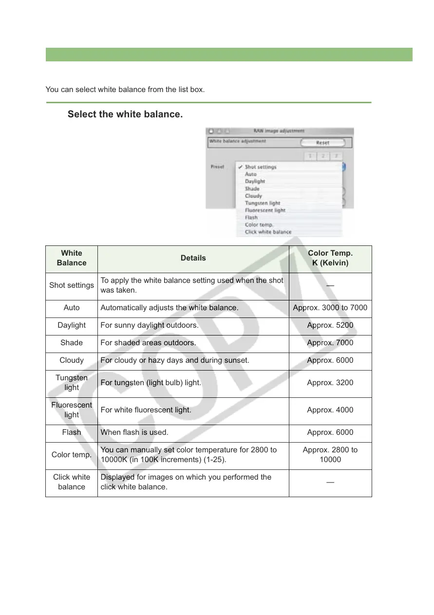 Auto Automatically adjusts the white balance. Approx. 3000 to 7000