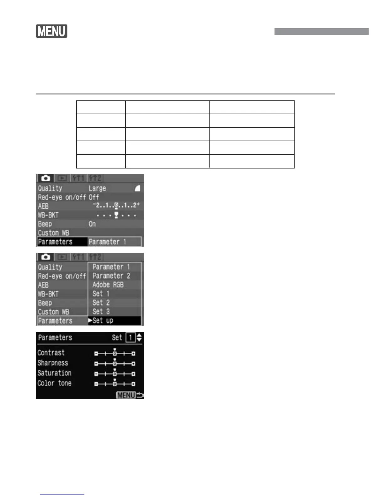 for [Contrast], [Sharpness], [Saturation], and [Color tone]). You can