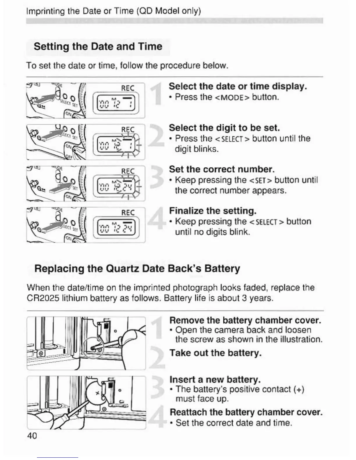 Canon EOS EOS 7 - Setting Date and Time; Replacing Date Back Battery