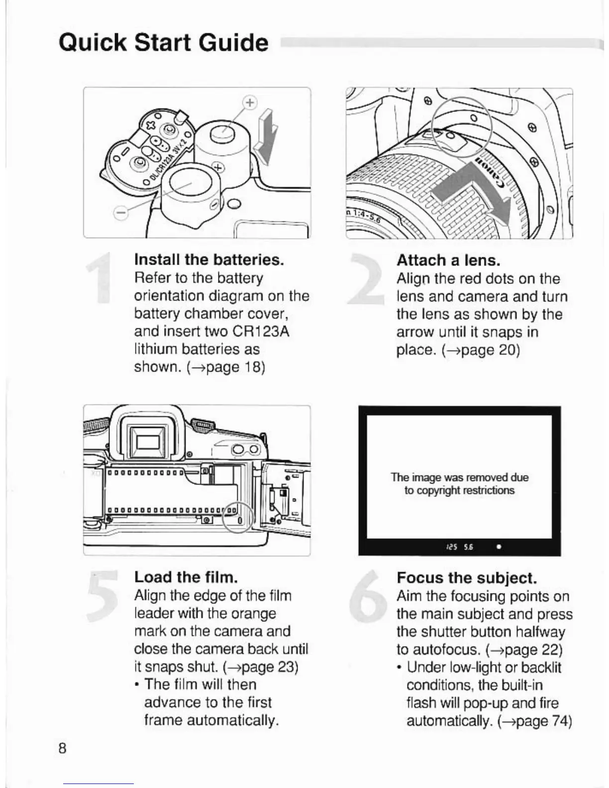Canon EOS EOS 7 - Quick Start Guide; Install and Attach; Load Film and Focus
