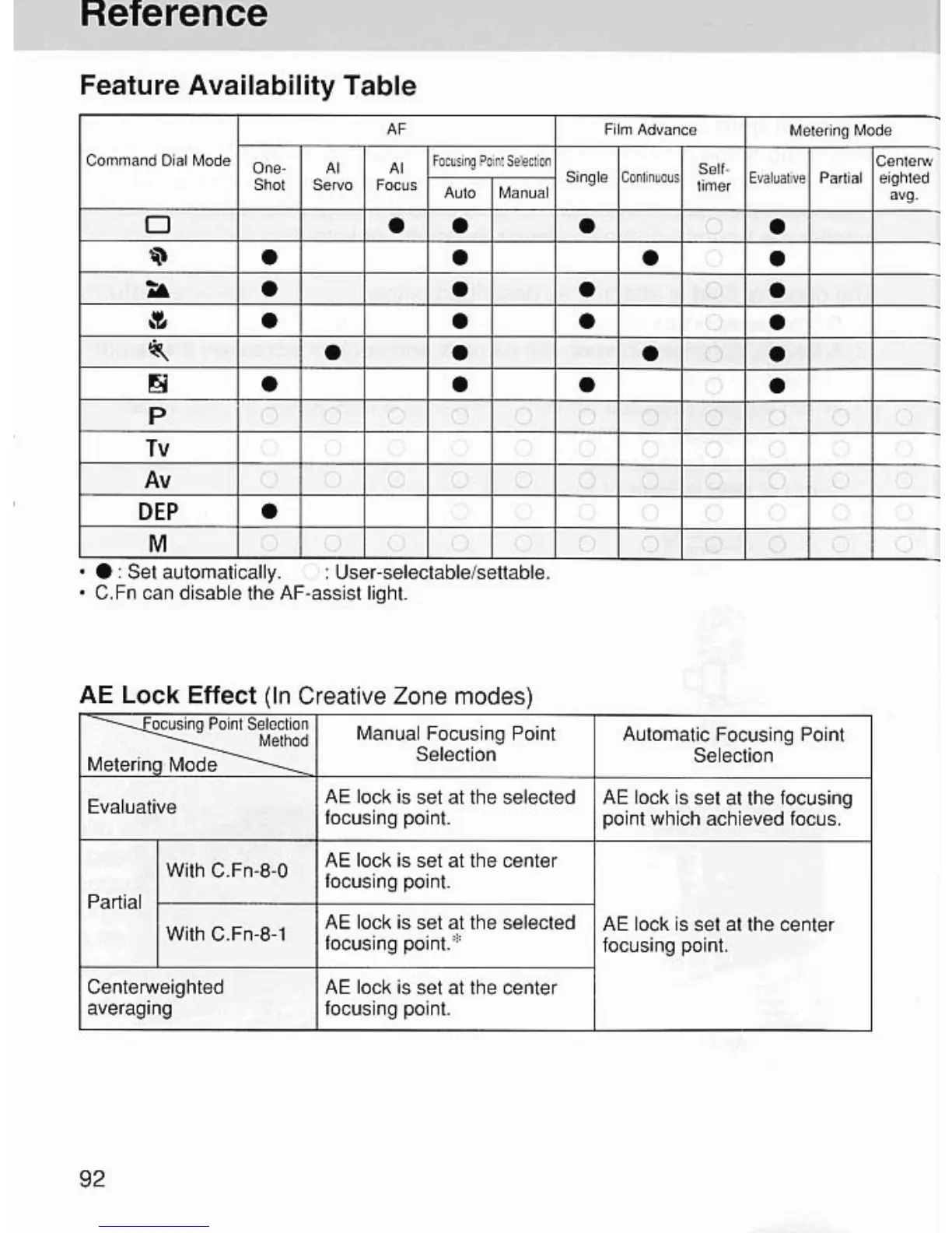 Canon EOS EOS 7 - Feature Availability Table; AE Lock Effect Table
