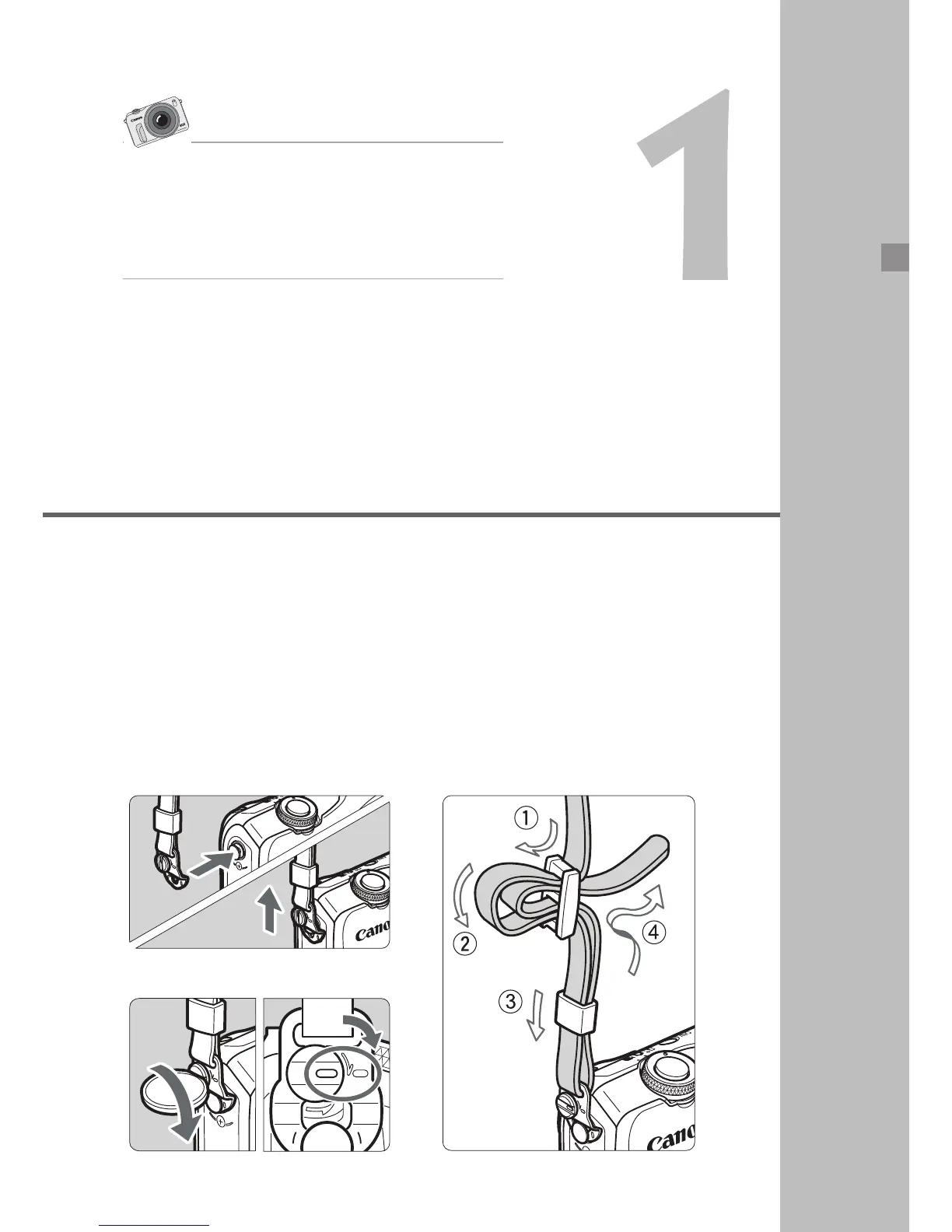 Fit the strap’s metallic ring over the camera’s strap mount. Use a