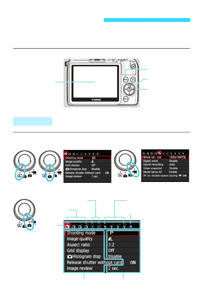 The menu tabs and items displayed will differ depending on the shooting mode.