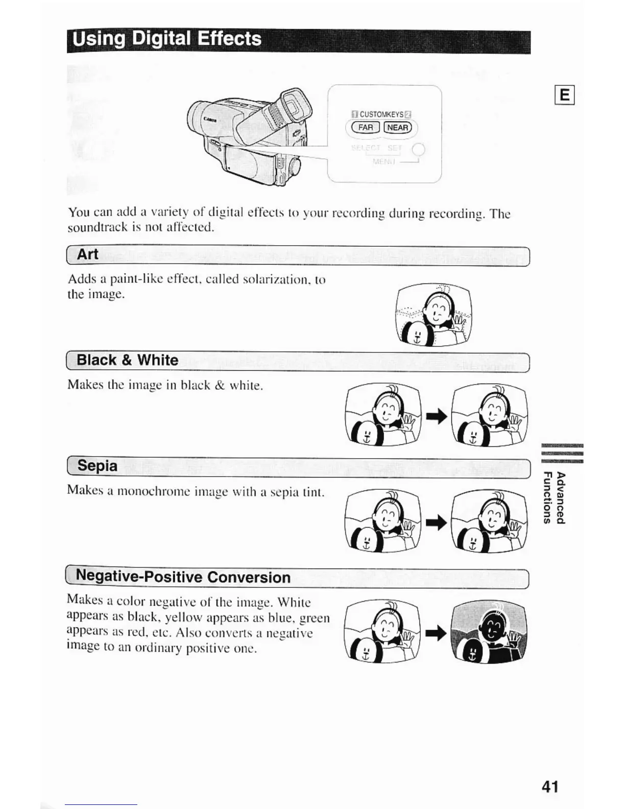 Canon ES290 - Using Digital Effects; Art Effect (Solarization); Black & White Conversion; Sepia Tone Effect