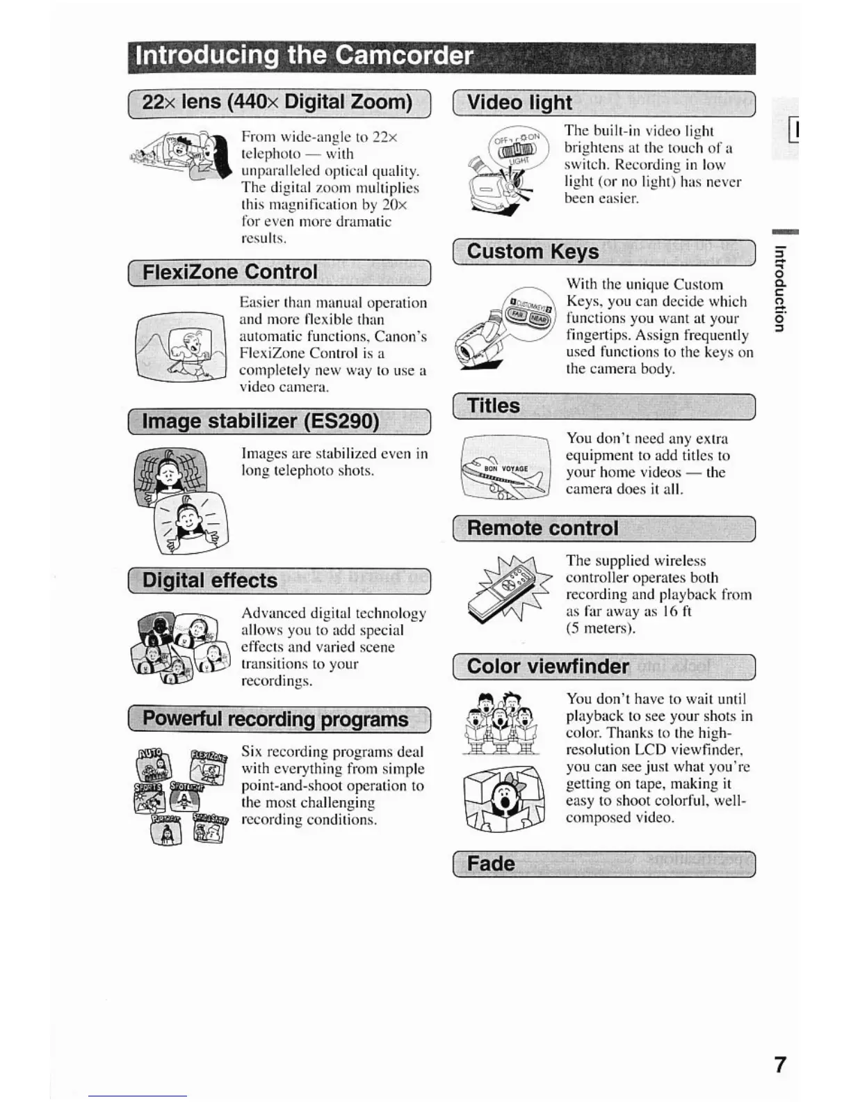Canon ES290 - Introducing the Camcorder Features; 22 x Optical and 440 x Digital Zoom; Video Light Functionality; FlexiZone Control System
