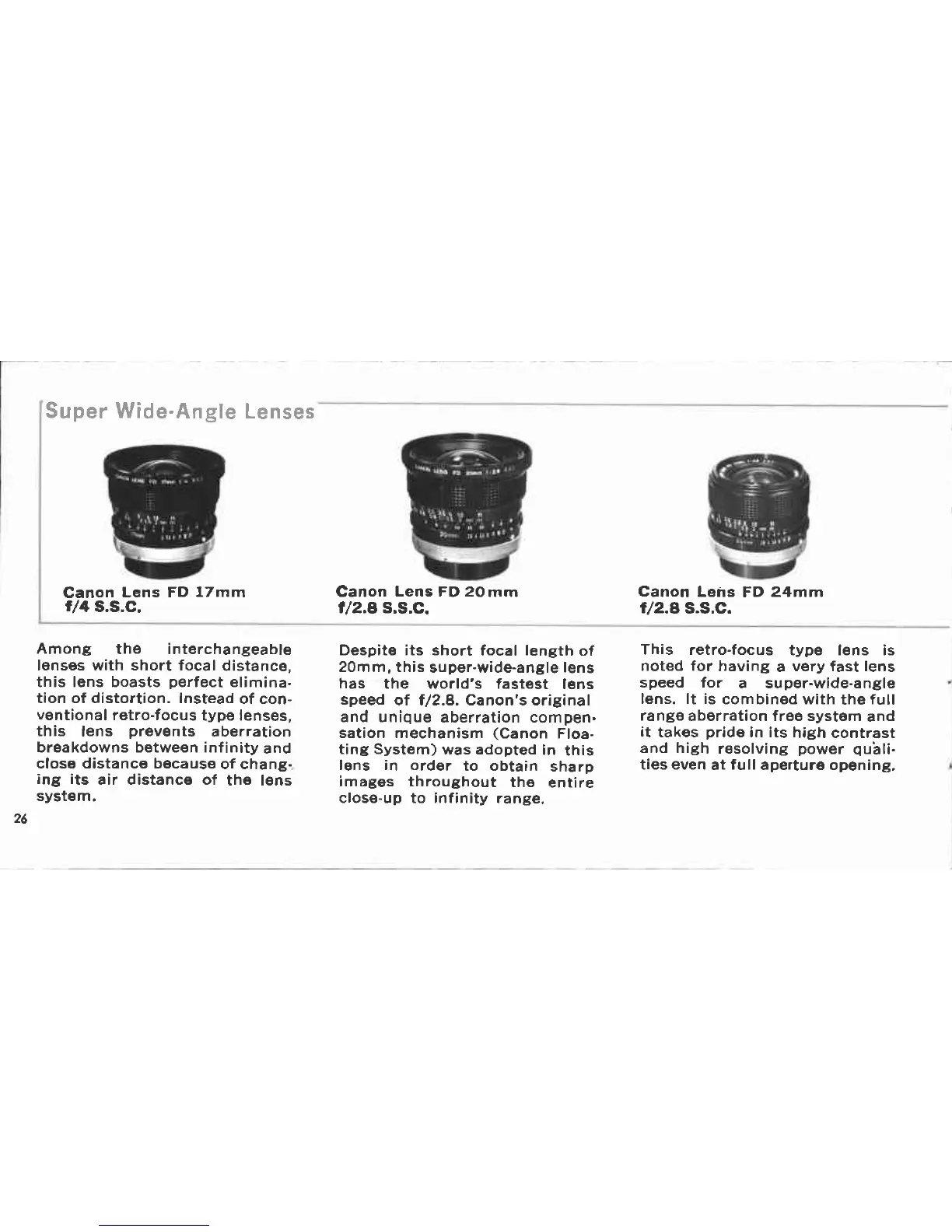 Canon FD - Super Wide-Angle Lens Range; Canon 17 mm f;4 Super Wide-Angle; Canon 20 mm f;2.8 Super Wide-Angle; Canon 24 mm f;2.8 Super Wide-Angle