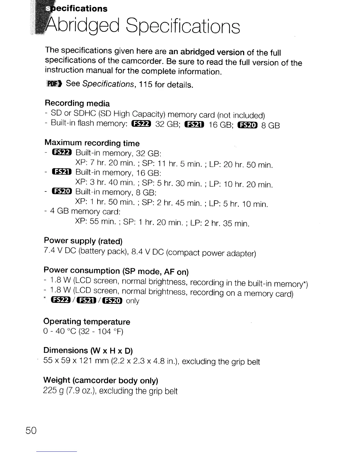- 1.8 W (LCD screen, normal brightness, recording