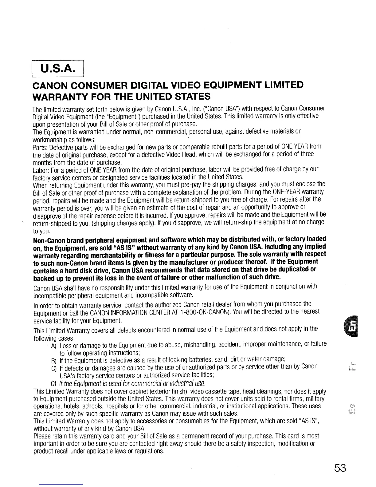Canon FS20 - U.S.A. Limited Warranty; Canon Consumer Digital Video Equipment Limited Warranty for the United States