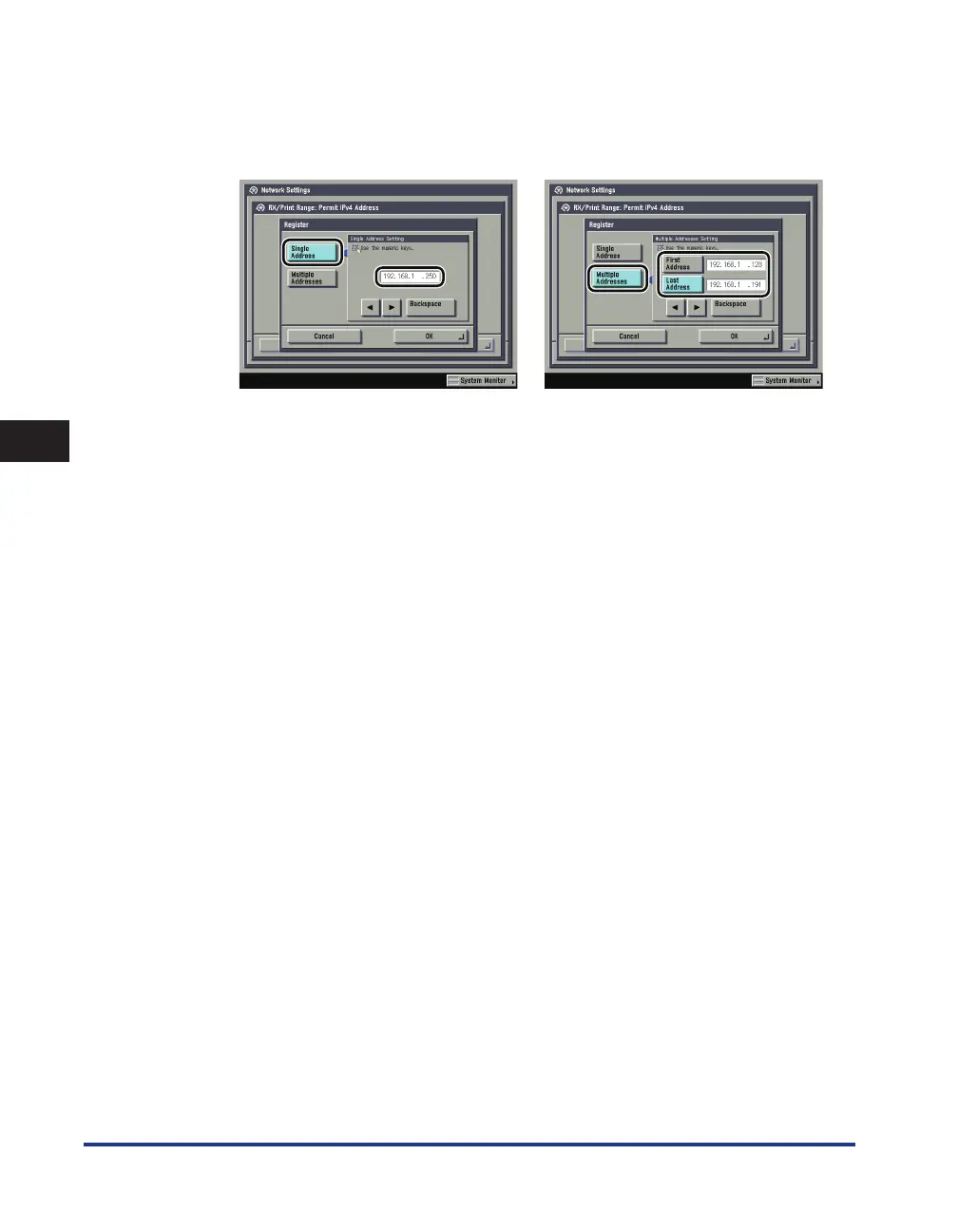 Press [Register] → store only one IPv4 address or a range of IPv4 addresses that are to be rejected.