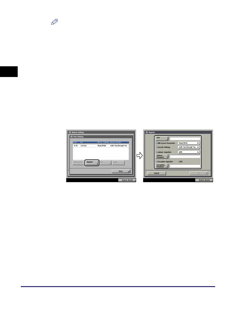 Press [User Settings] ➞ [Register] ➞ specify the user name, MIB permissions,
