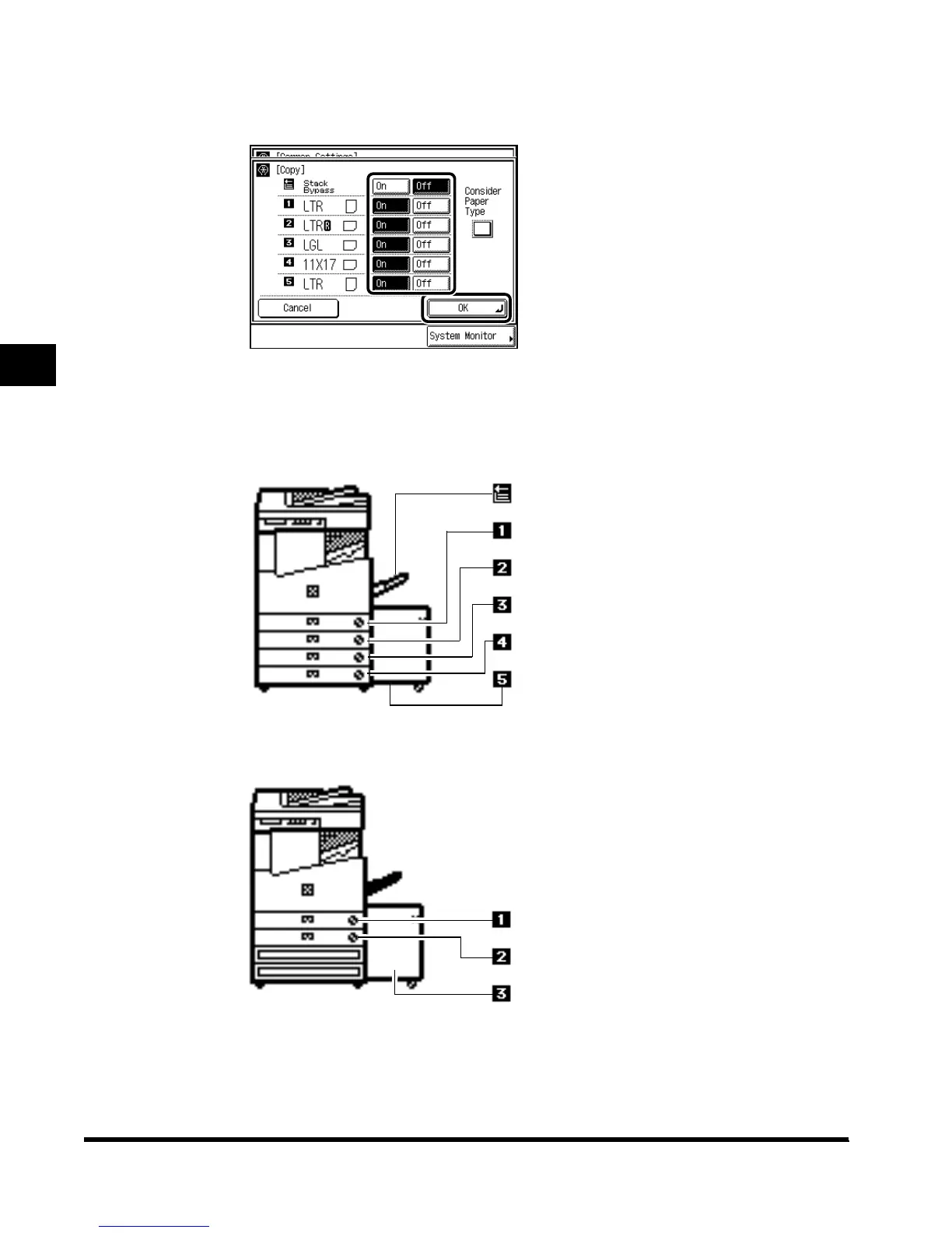 Select “On” or “Off” for the stack bypass and each paper drawer,